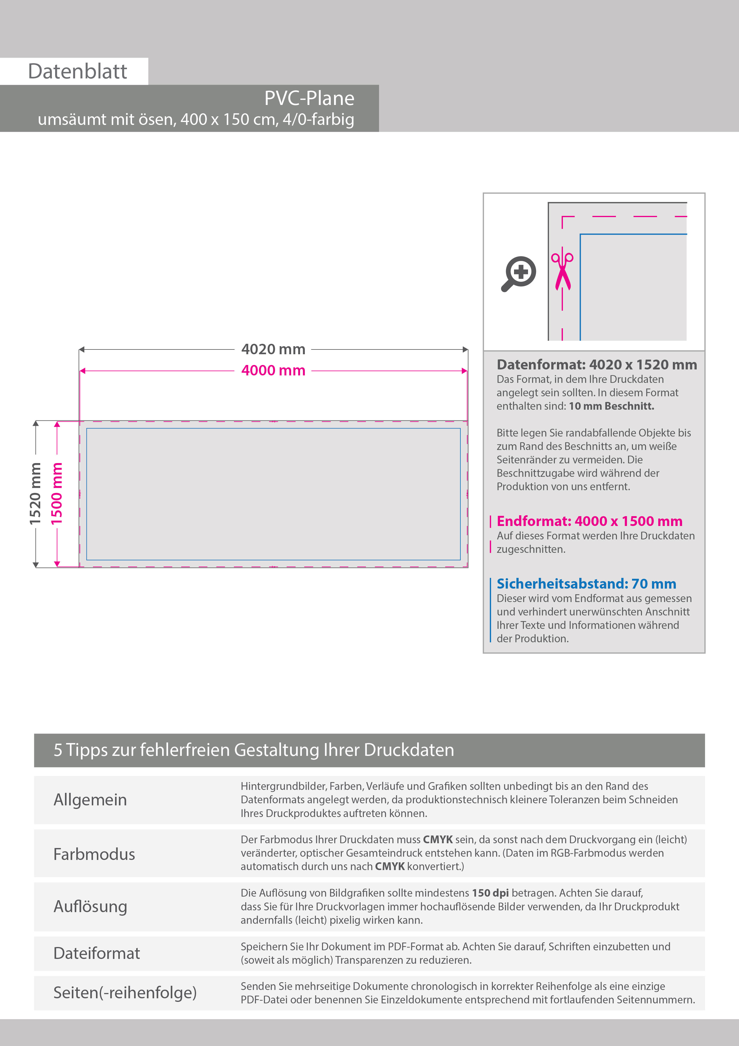 Hochwertige PVC-Plane 400 x 150 cm, 4/0-farbig bedruckt, Umsäumt + Ösen im Abstand von 50 cm rundum